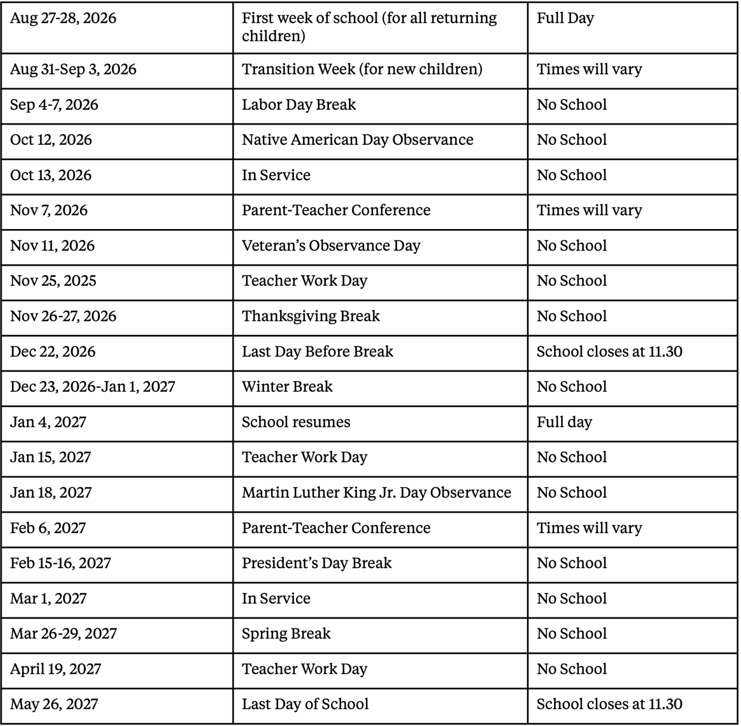 Calendar 2025-2026 2026-2027 You can subscribe to the Baan Dek Calendar here. We follow the Sioux Falls Public School Calendar for holidays, closures, and inservice days.